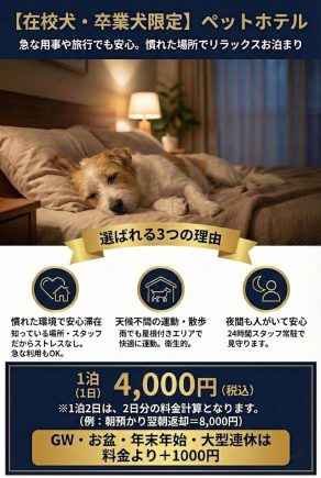 1日(1泊): 4,000円(税込) ※在校・卒業犬限定のサービスです。