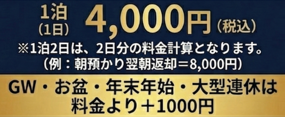 1泊2日の場合 = 2日分の料金(8,000円)となります。 (例:朝にお預かりし、翌朝にお返した場合など)